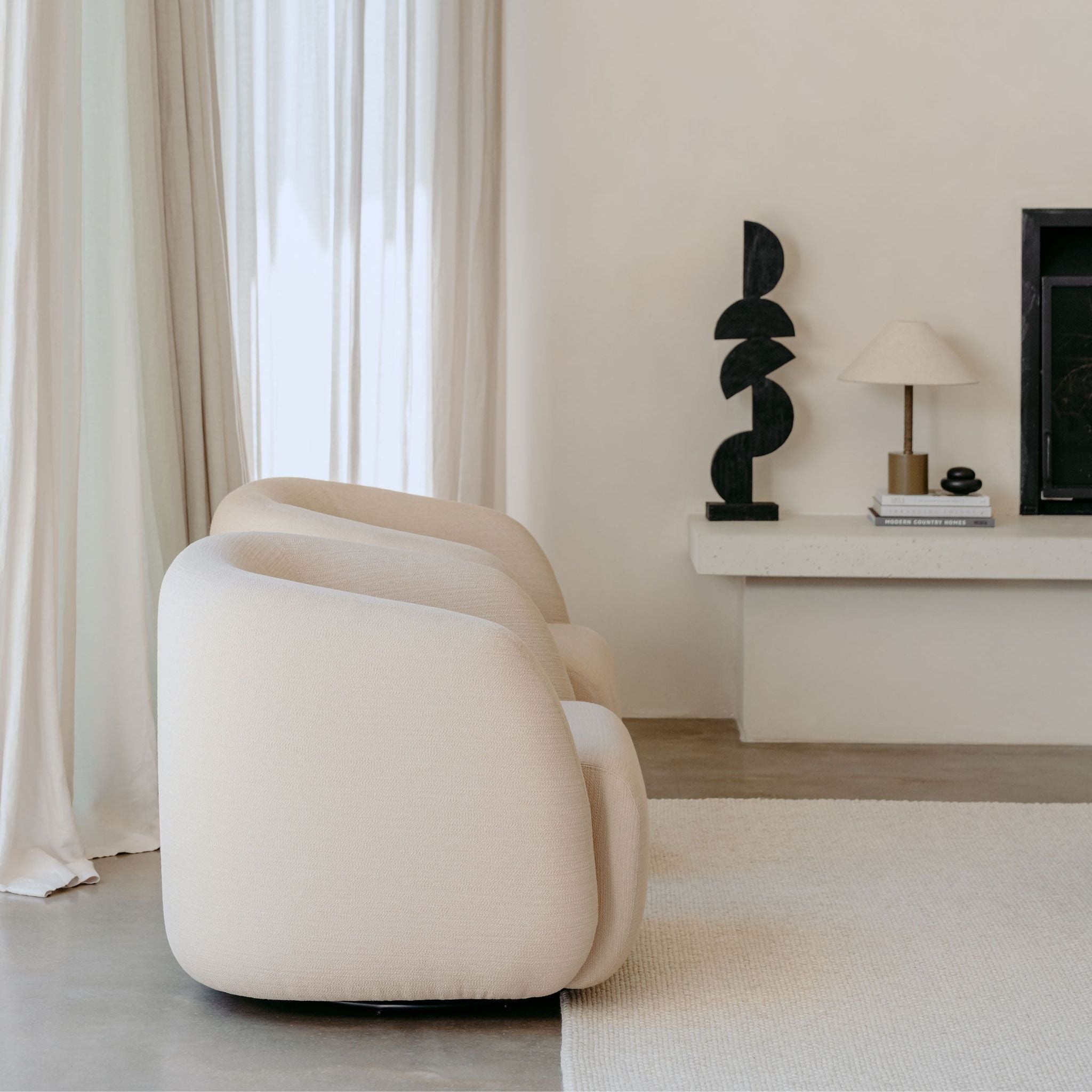 The Rueben Armchair brings together sculptural form and everyday comfort, making it a refined addition to any living space. Designed with soft, organic curves and a discreet swivel base, Rueben offers relaxed movement and versatility — perfect as a reading nook feature or a stylish companion to your sofa.