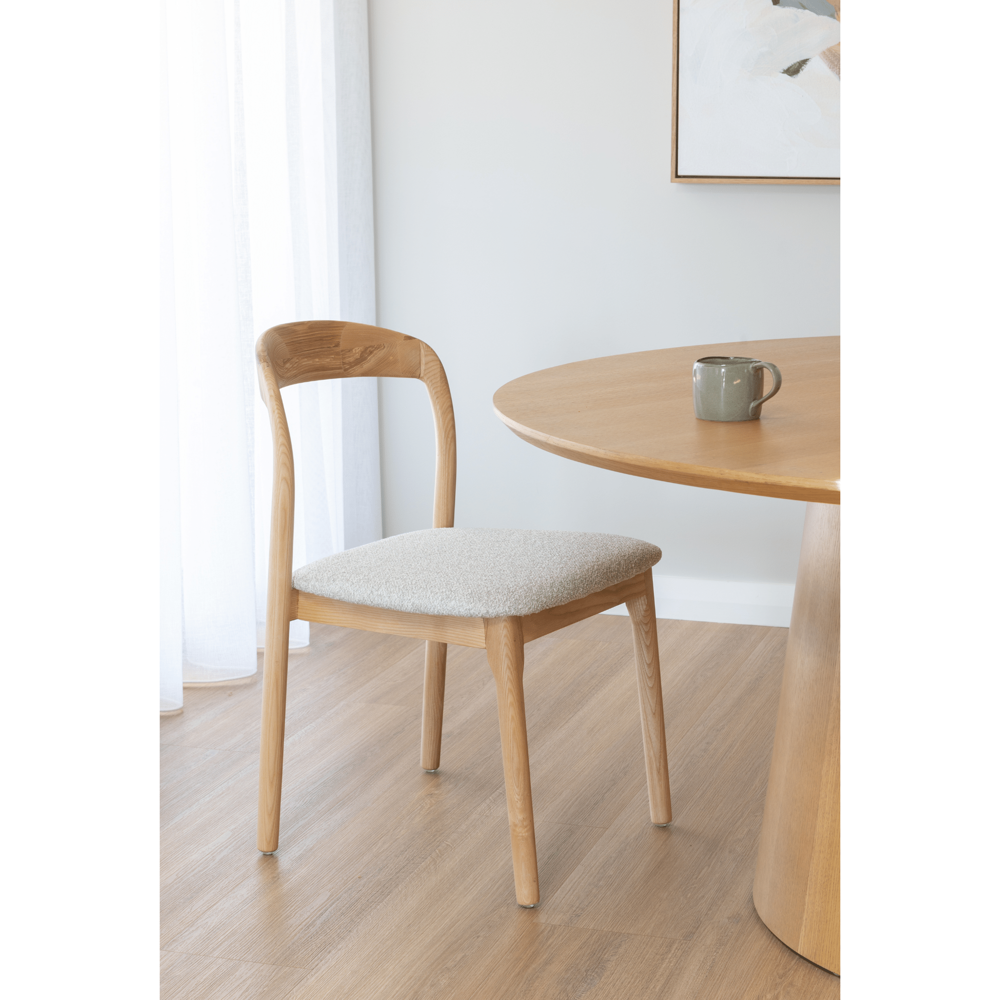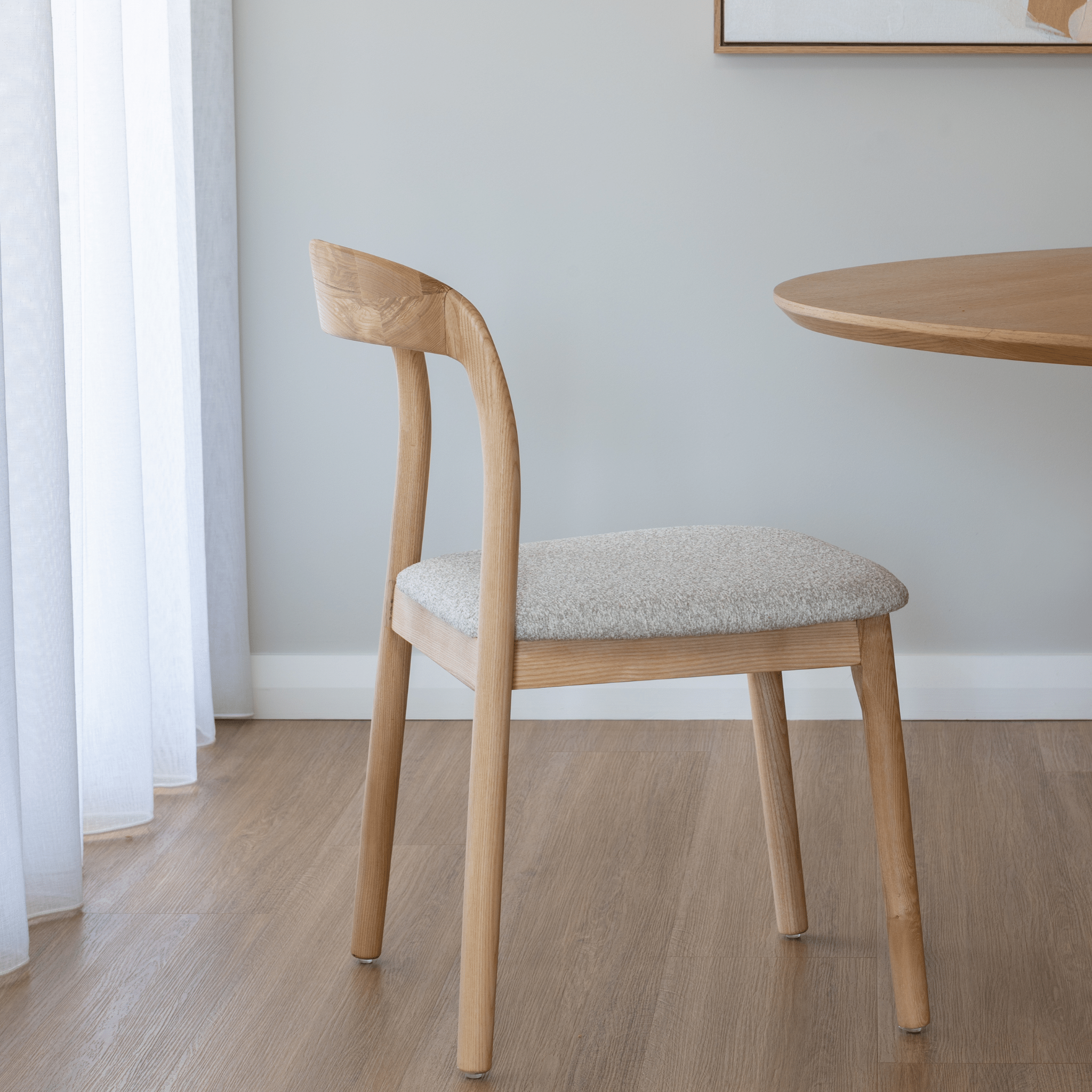 Introducing our new and improved Theo Dining Chair.  The design seamlessly blends modern elegance with timeless craftsmanship, making it a perfect addition to any dining space. The curved frame showcases the natural beauty of the wood grain, adding warmth and sophistication to your decor. Meanwhile, the fabric upholstered option offers a plush seating experience.