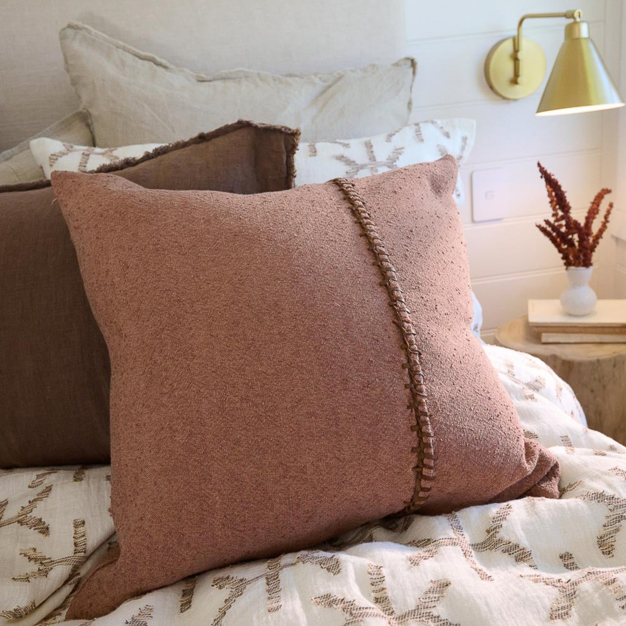 Made from a blend of cotton and linen, each cushion cover is individually dyed and hand embroidered with a leather contrast detail.