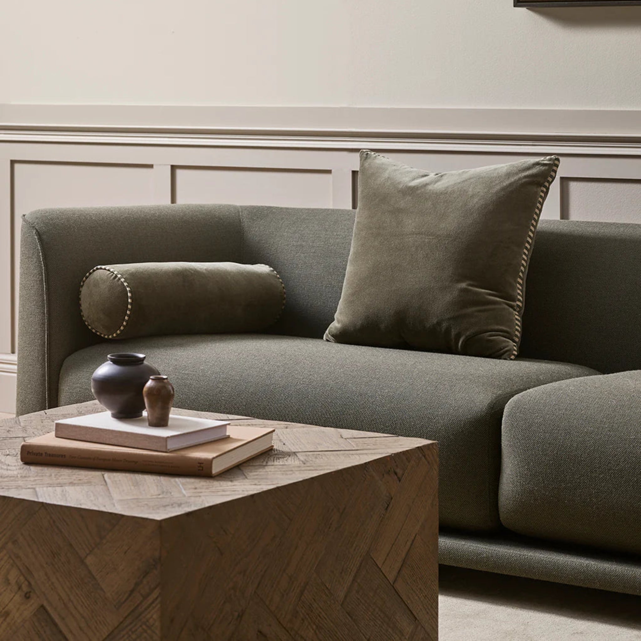 This dusky green cushion showcases a sophisticated blend of tactile and structural elements. Crafted from sumptuous cotton velvet, it features a geometric box construction refined by striped linen gussets that add visual interest and dimension.