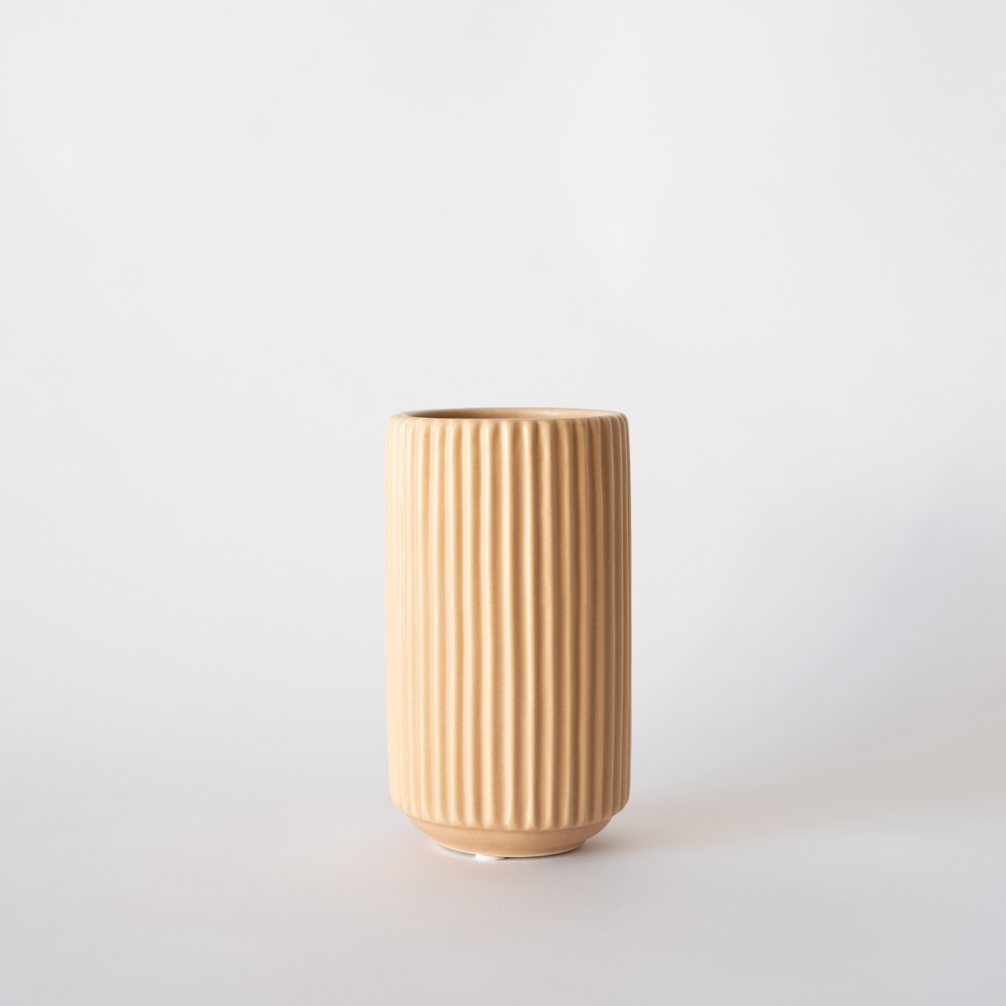 The Lara vase - apricot, a beautiful, soft, dusty tone, with a ribbed texture and elongated composition - the ribbed outer of the Lara Vase allows for the perfect shadowing detail.