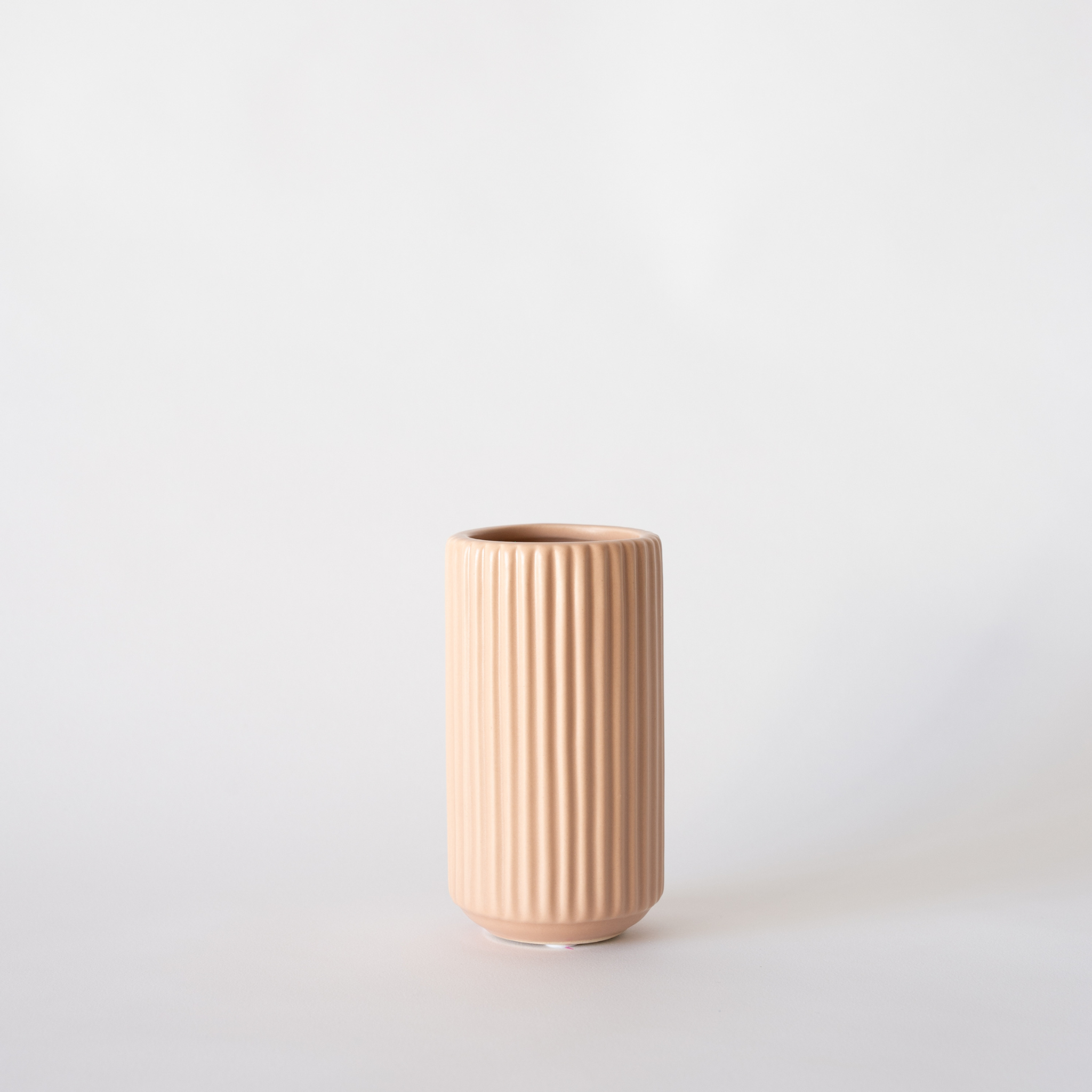 The Lara Ceramic Vase - nude, a beautiful, soft, dusty tone, with a ribbed texture and elongated composition - the ribbed outer of the Lara Vase allows for the perfect shadowing detail.