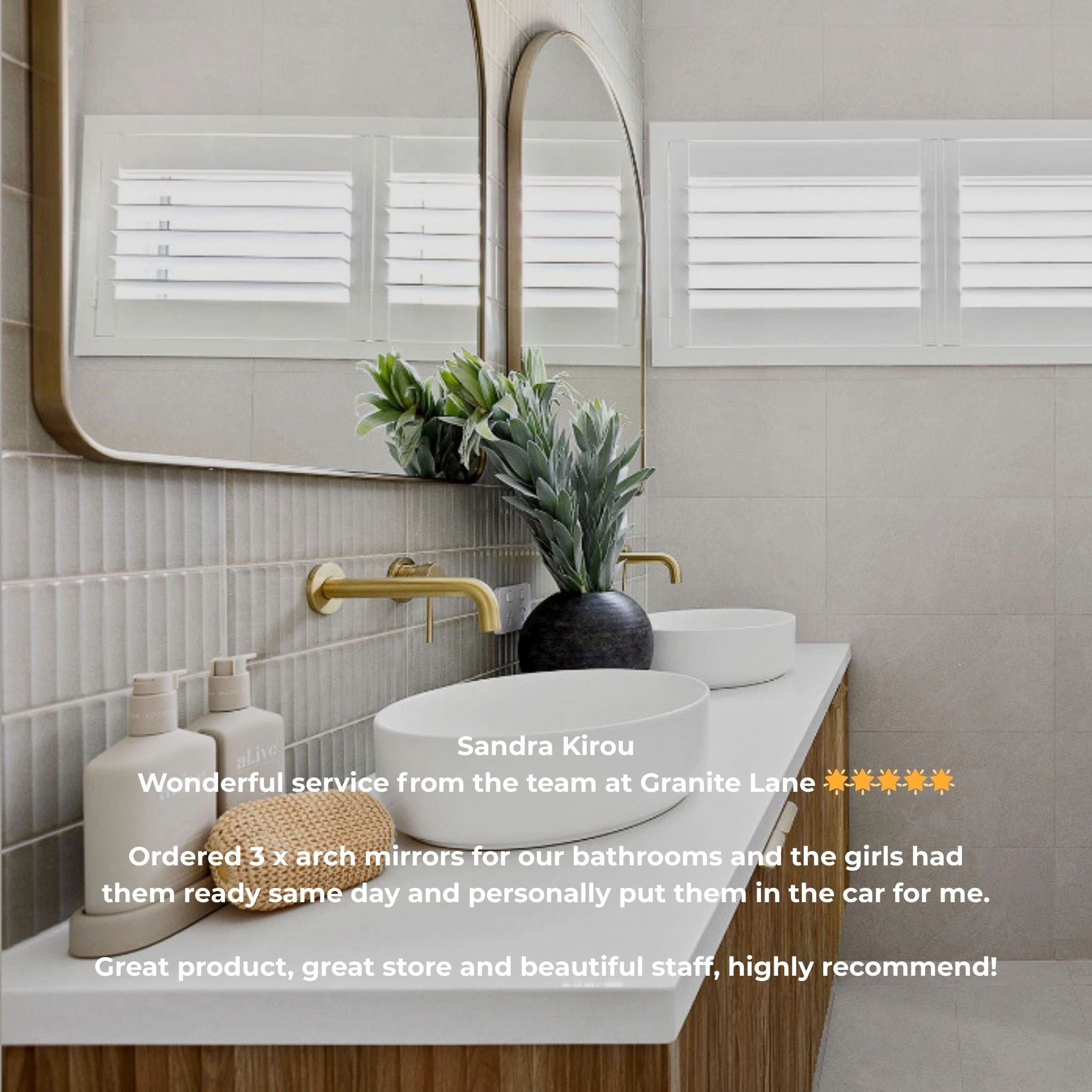 A modern arch, slimline brass stainless steel frame with ACP backing allows these beautiful mirrors to hang in your bathroom for years to come. Granite Lane only uses quality-glass for a crystal clear reflection.