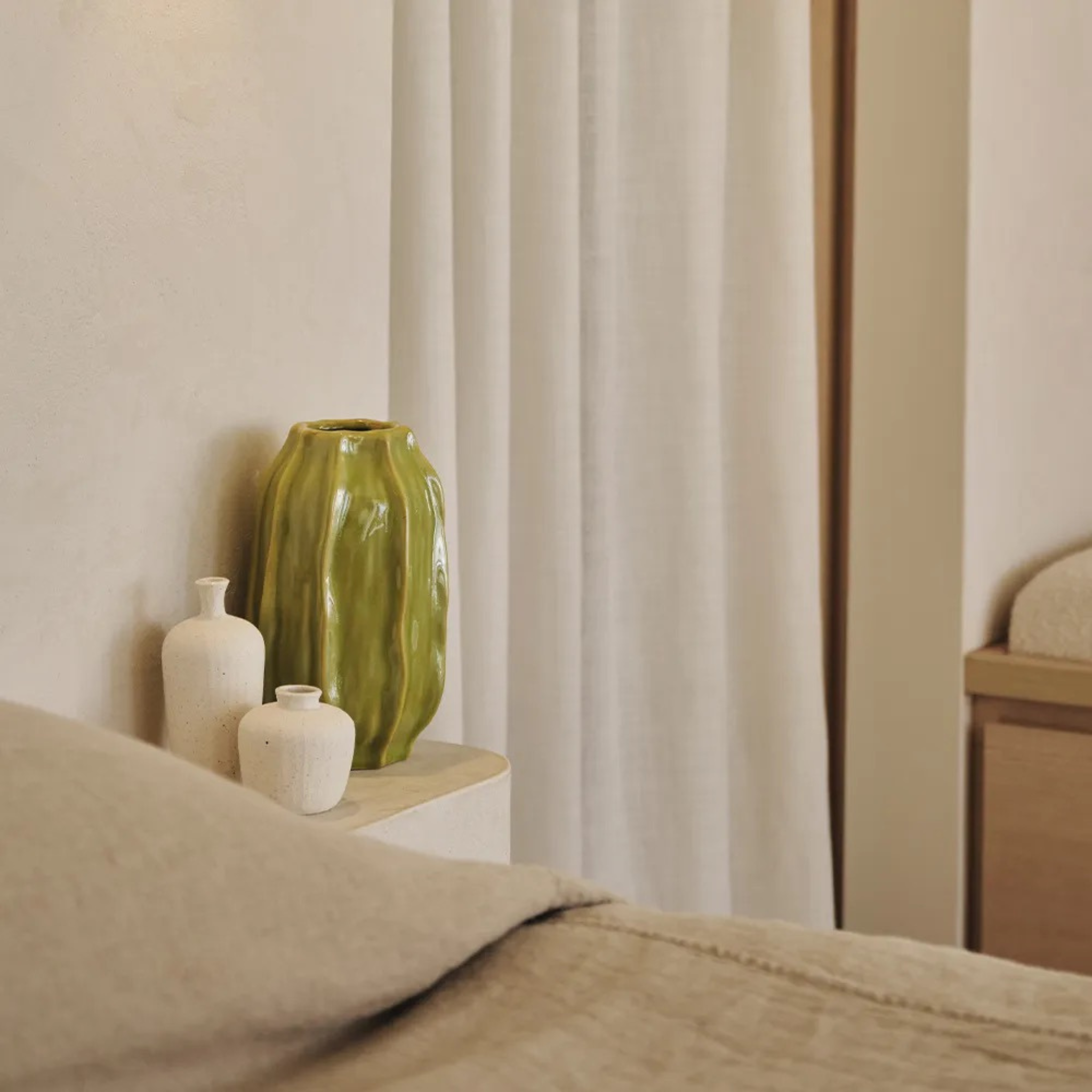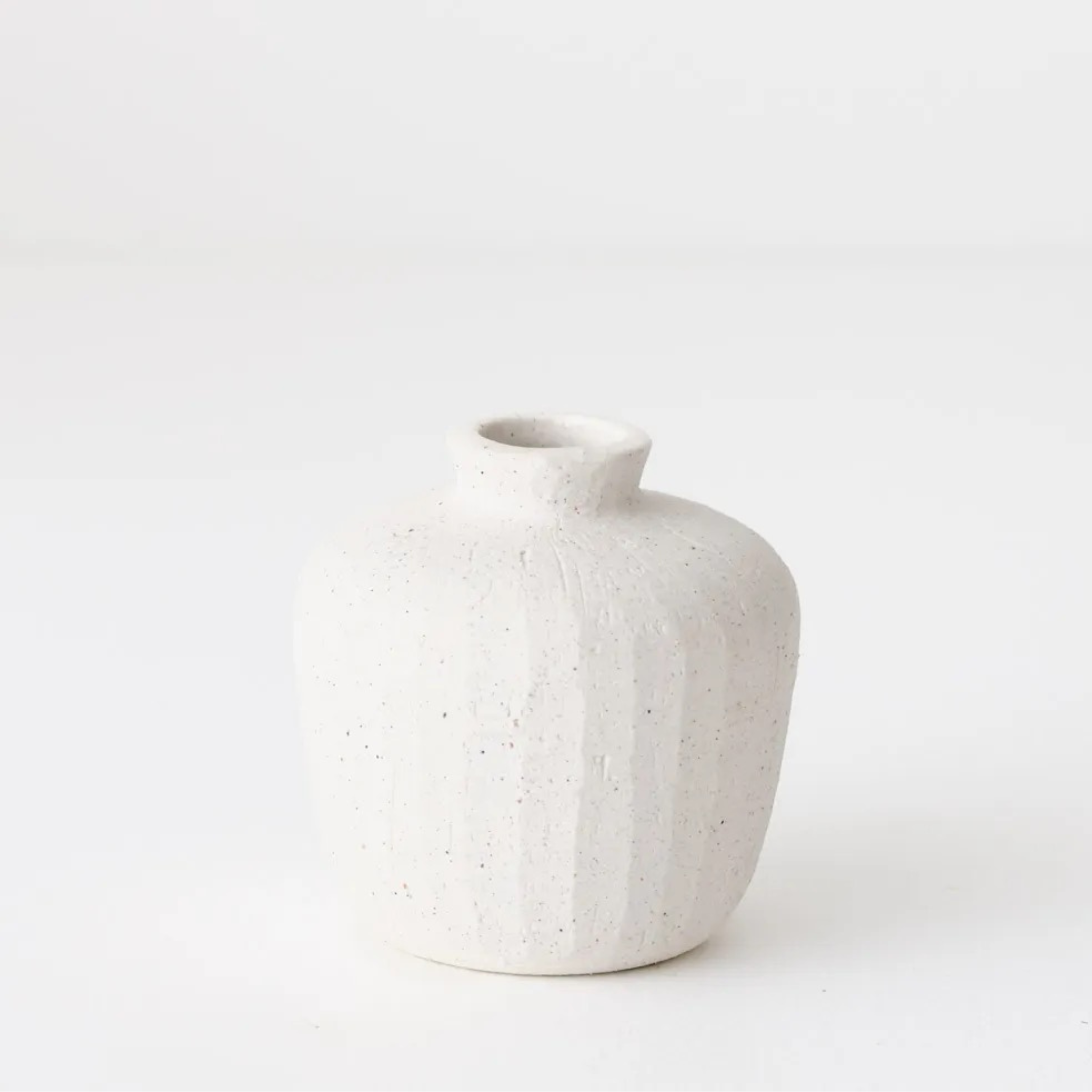 The Cora Vase exemplifies refined restraint—a textured white ceramic piece that bridges functional vessel and sculptural object. Its matte finish and subtle surface relief create tactile depth without visual noise, while the clean geometry suits contemporary and transitional interiors alike.