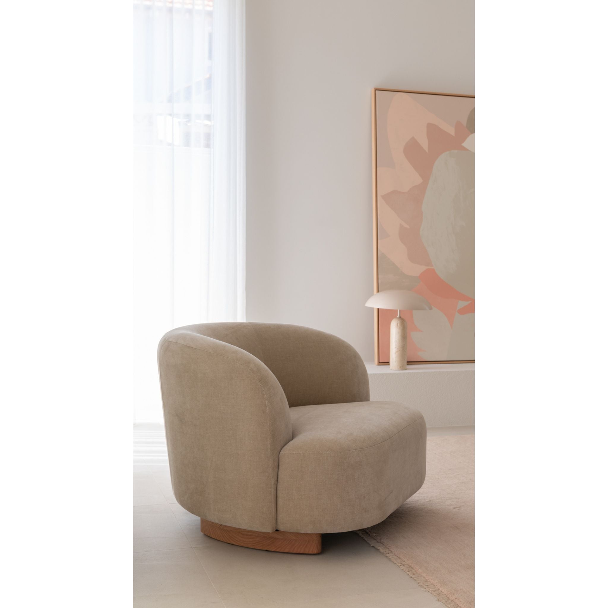 Soft curves and a solid hand made timber feature leg make it the ideal companion for your sofa. Crafted locally, this armchair can be personalised with your preferred fabric, whether it's a luxurious soft linen or a sumptuous rich velvet.