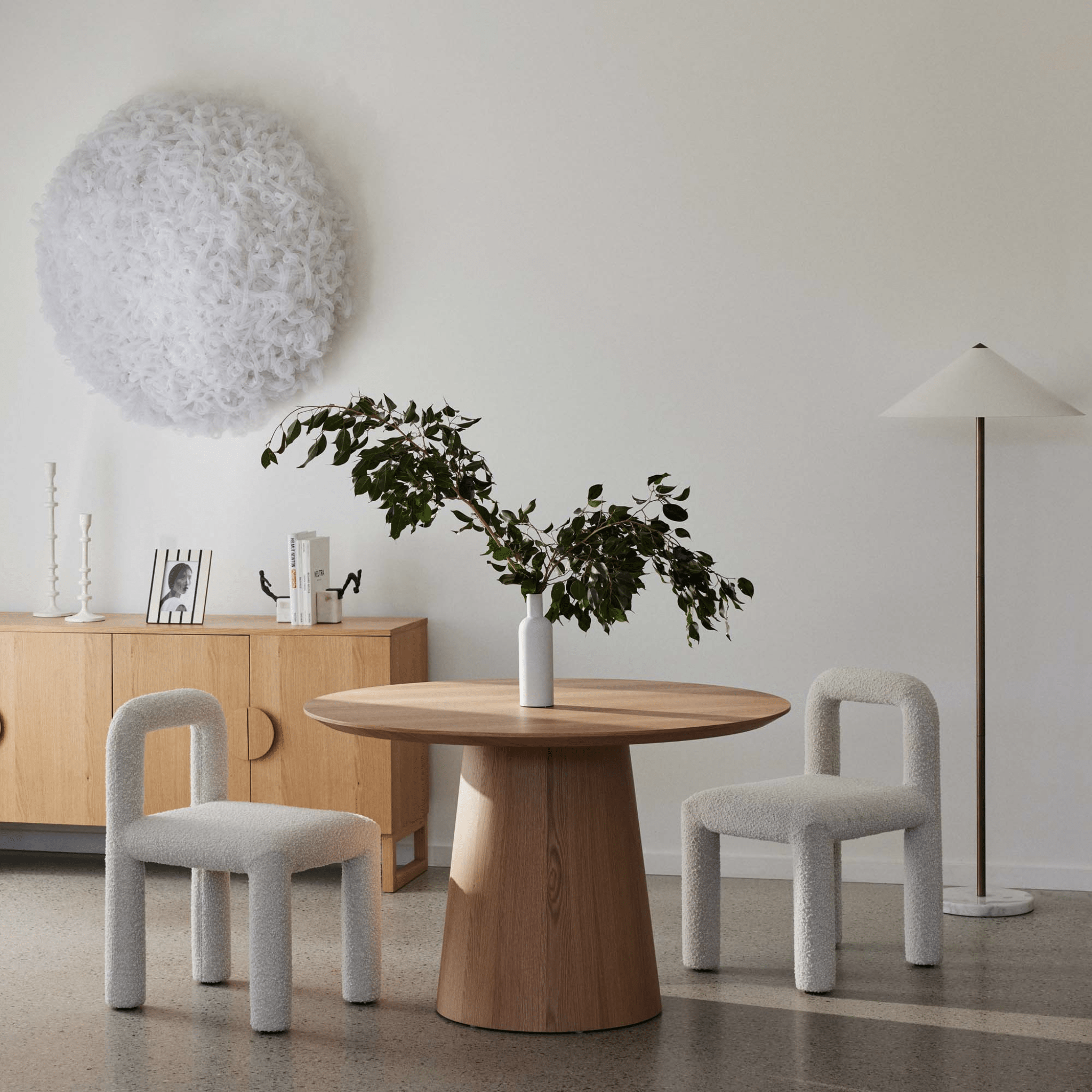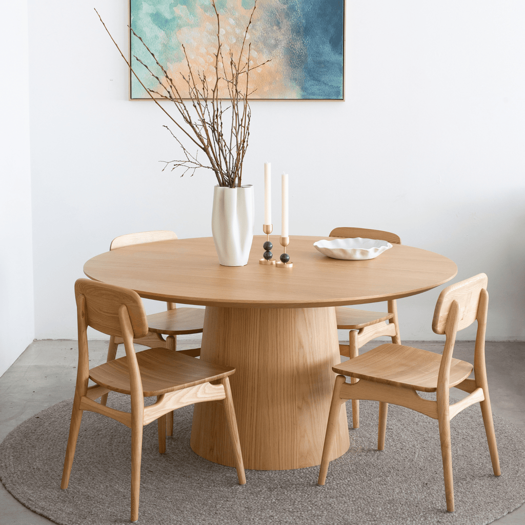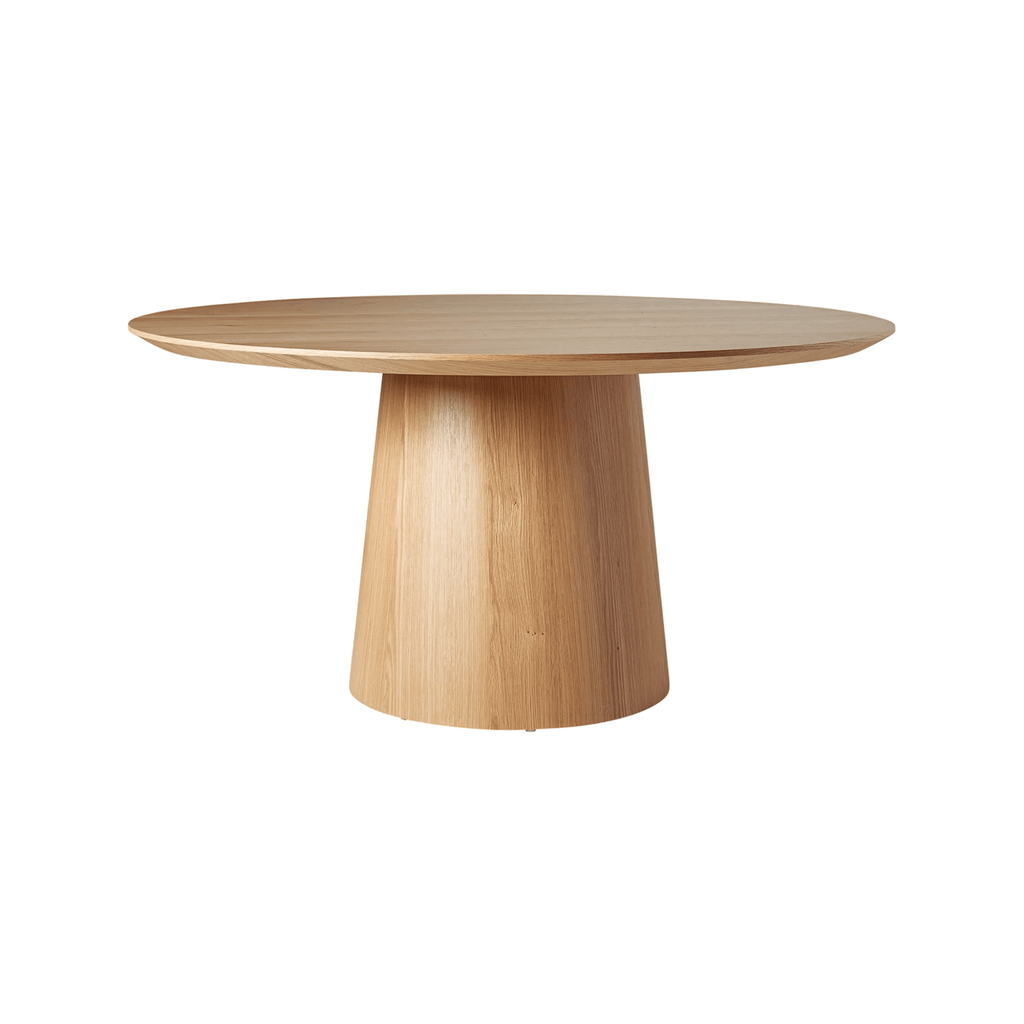 The Casa Round Dining Table - Natural adds a touch of refined elegance to your home or workplace. Crafted with a 40mm thick oak veneer top, this round dining table boasts a tapered circular base measuring 60cm in diameter at its widest point.