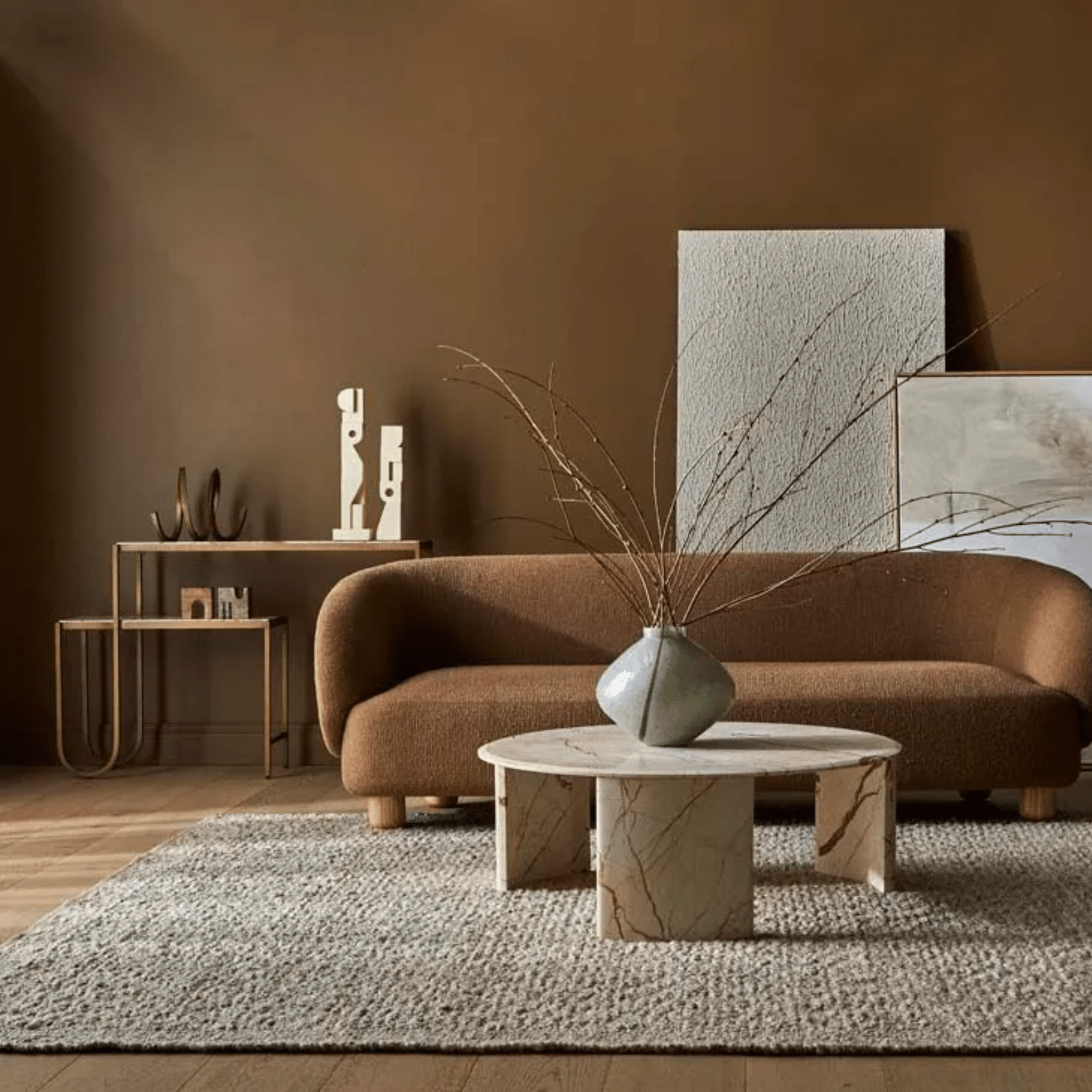 The Henry Marble Coffee Table features elegant curves constructed with beautiful natural brown vein marble, creating a modern and spacious aesthetic that is ideal for contemporary interiors.