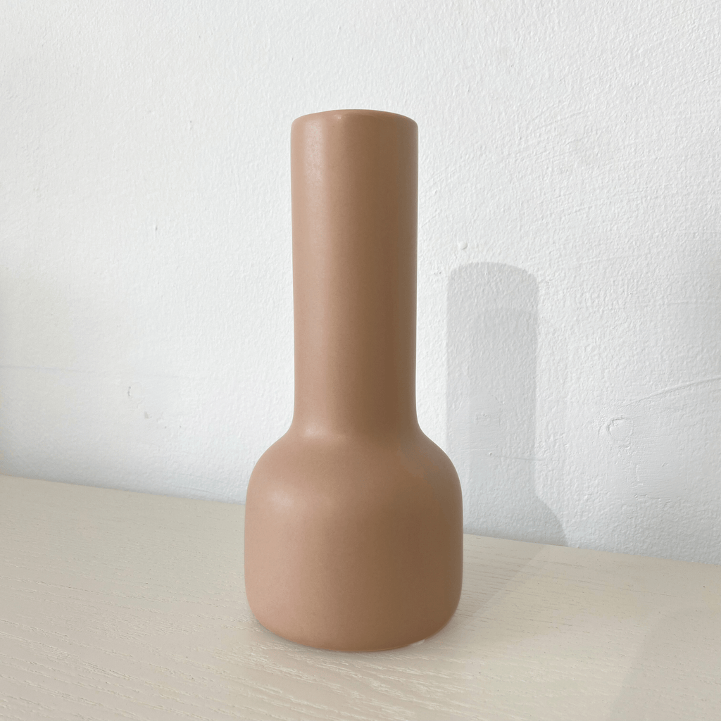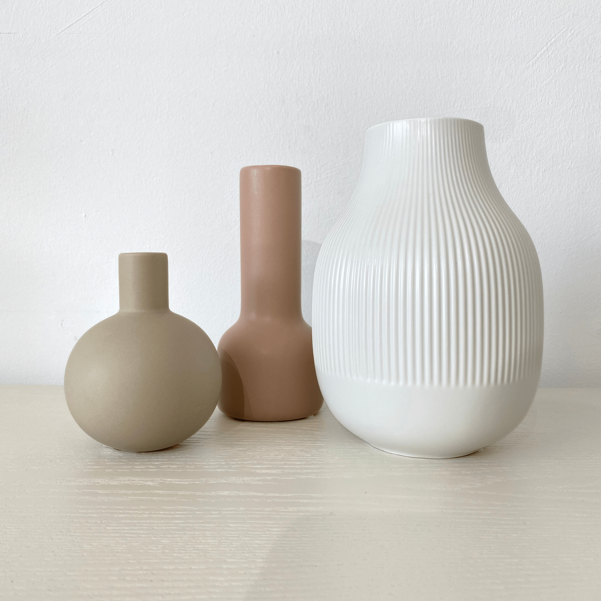 The Lacie Vase features a sleek matte soft ochre finish and a sculpted design, making it a perfect addition to any styling vignette.