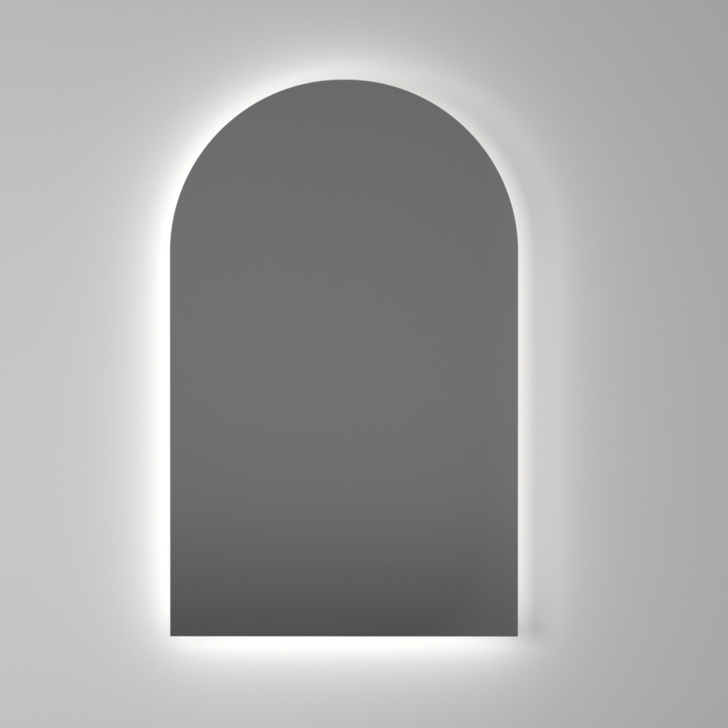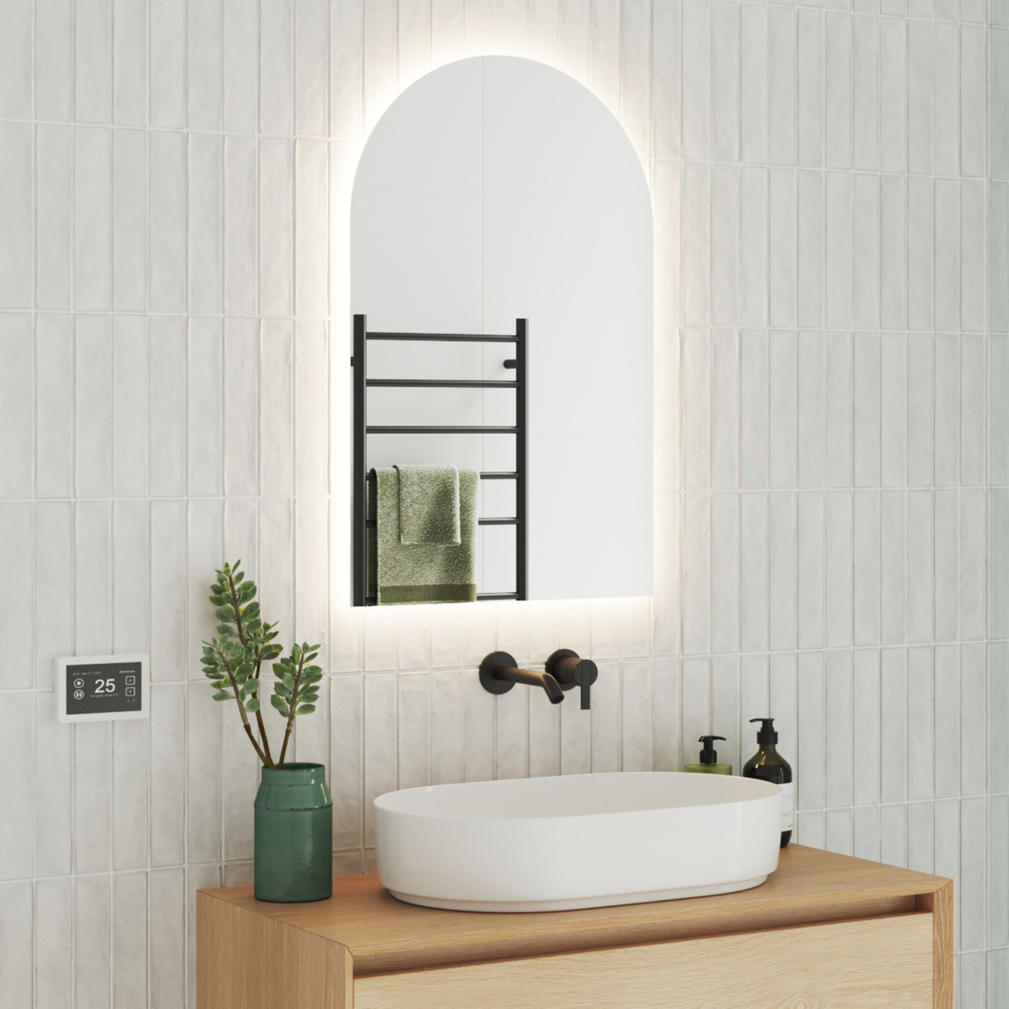 This modern slimline LED Arch Mirror, features a 5mm thick silver mirror with a polished edge border. The cool gentle light shines from behind the mirror offering a soft luxurious feature to your bathroom.