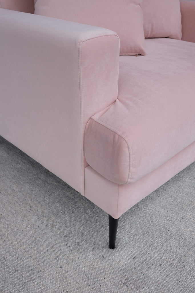 Choose from a spectrum of colors and fabrics to suit your taste. Featured here is our elegant sofa upholstered in soft pink Warwick velvet fabric, complemented by sleek black metal Valentino legs. Explore our Marlie Sofa collection, also available as an armchair and modular option.