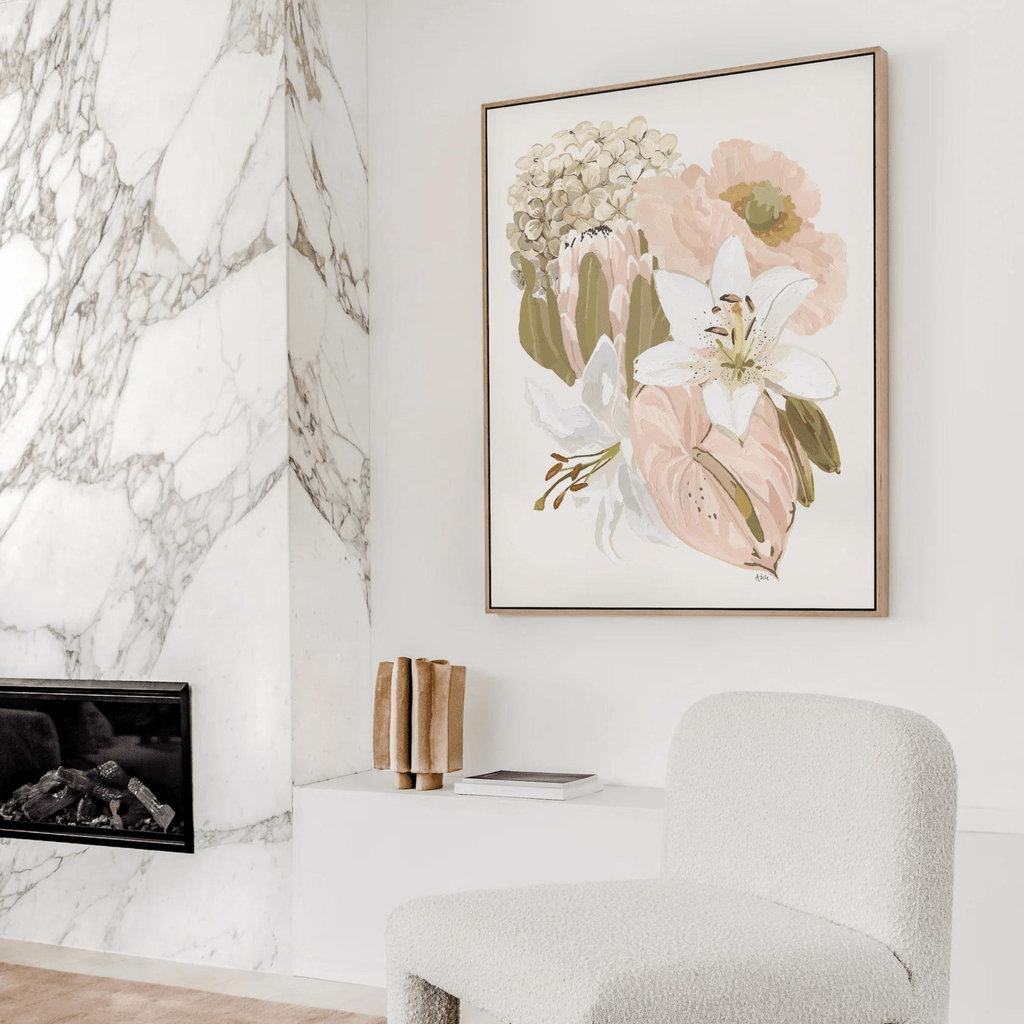 Featuring a protea, anthurium, lilies, hydrangea stem and poppy. The palette is neutral with tones of greens, pinks and peach. Proteas have associations to change and transformation, in the language of flowers, protea symbolizes diversity and courage.