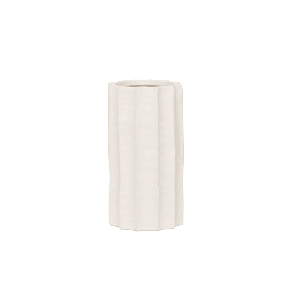 Ceramic vase in a matt white finish. Designed to present flowers, but with its beautiful scalloped vertical edges and battered skin stands out on its own.