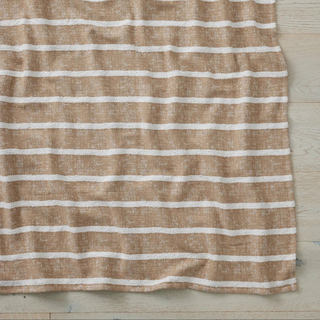 The Piazza Throw by Weave Home has a textured, bouclé stripe and a soft hand feel in a muted earth colourway.